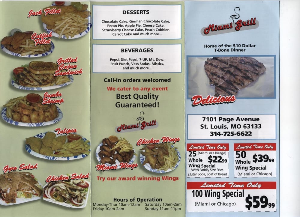 Miami Grill, located in St. Louis, MO, offers a diverse menu of desserts, chicken wings, and steaks. With a range of utilities like takeout, reservations, catering, and more, this establishment caters to a variety of preferences. Customers rave about the flavorful dishes, highlighting the perfectly cooked steaks, crispy chicken wings, and delicious desserts. The catfish and shrimp are particularly recommended, with patrons praising the generous portions and well-seasoned flavors. The grilled chicken dinner and Chicago-style chicken wings are must-tries, according to regulars. Whether dining in or ordering takeout, Miami Grill promises a satisfying experience with friendly staff and tasty, customizable meals. Don't miss out on this STL staple for a memorable culinary adventure.